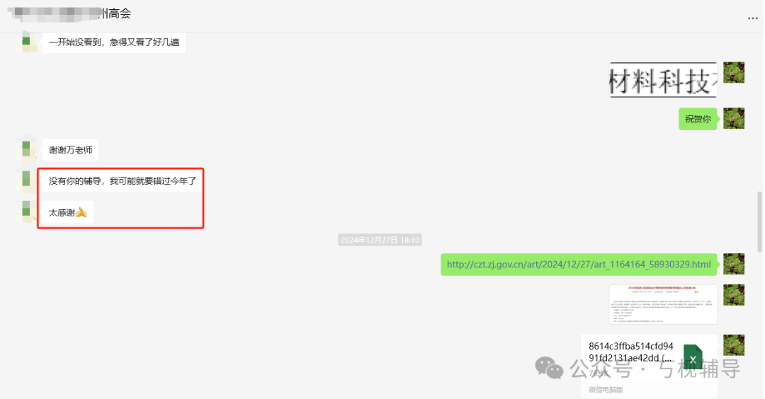 该学员2023年报的某机构,被机构诱导升级辅导服务,花了好多钱,但业绩做得自己都不满意,通过公众号找到万老师,交待了自己已经花费巨资辅导了,但材料搞成半拉子,自己都不满意,网校还再进一步诱导升级更高级套餐,万老师考虑到一个普通财务经理已经支付高额的辅导费用,就先帮她材料重新梳理,完善了总结,没收钱,她23年顺利通过!