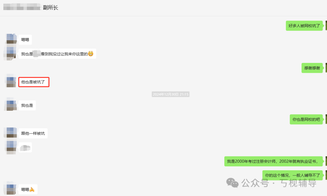 万老师表示,并非是机构坑了他,而是会计师事务所业绩是非常专业的审计、咨询、鉴证类业绩,如果老师不是资深的执业注册会计师,根本辅导不了,还不能怪辅导机构坑,是他们真的没这个水平!